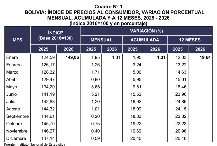 El Instituto Nacional de Estadística (INE) reportó que Bolivia cerró el primer mes del año con una inflación de 1,31%, 0,72% más que la que había registrado en diciembre de 2025.