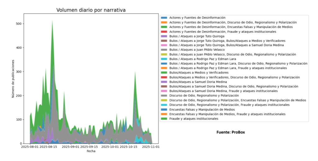 - 17 de agosto (primera vuelta): Bolivia Verifica registró uno de los mayores volúmenes de desmentidos del proceso, con cerca de 10 contenidos falsos identificados ese día. En paralelo, ProBox contabilizó 380 menciones centradas en denuncias de fraude y encuestas falsas.