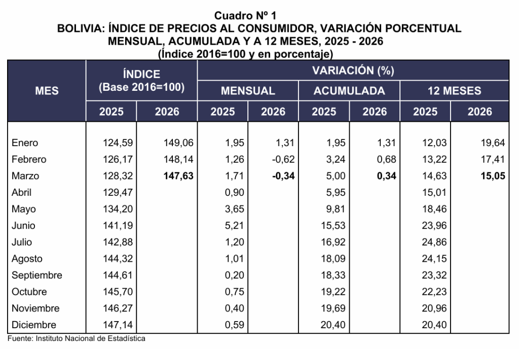 El Instituto Nacional de Estadística (INE) reportó este lunes que la inflación durante el mes de marzo de 2026 tuvo una reducción de -0,34%. Así, los datos indican que la acumulada llega al 0,34% y la variación a 12 meses alcanzó el 15,05%.
