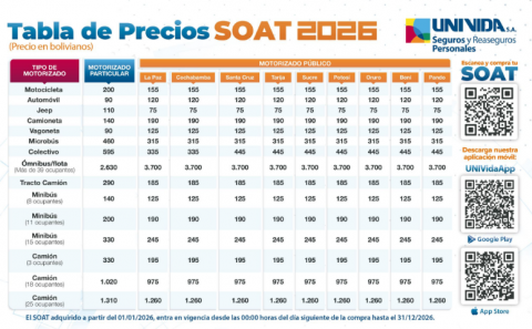 El gerente general de Univida, Larry Fernández, destacó que el precio del SOAT se mantiene invariable desde hace cinco años y ofrece cobertura de hasta Bs 24.000 en gastos médicos y Bs 22.000 adicional en caso de fallecimiento.