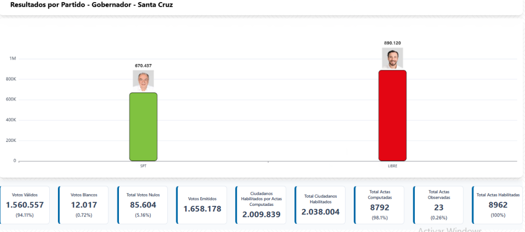 Según los resultados del Sistema de Resultados Preliminares (Sirepre), Juan Pablo Velasco es el nuevo Gobernador del departamento de Santa Cruz.