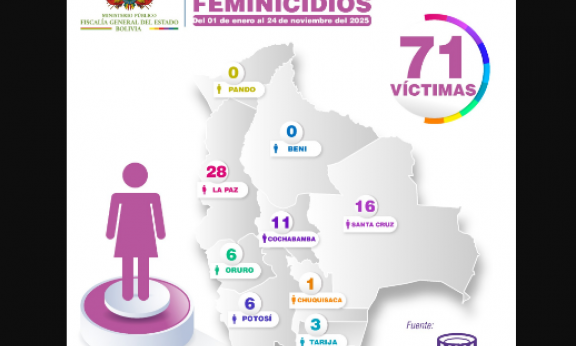 Según el informe oficial de la Fiscalía, en La Paz se registraron 28 casos de feminicidios hasta la fecha. Le siguen Santa Cruz (16) y Cochabamba (11).