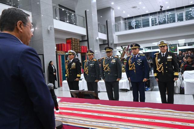 Por su parte, el contralmirante Gustavo Primitivo Anibarro Escobar, quien juró como Comandante en Jefe Interino de las Fuerzas Armadas, ratificó su compromiso de conducir la institución “en estricto apego a la Constitución Política del Estado, preservando la paz, la unidad nacional y las instituciones”.