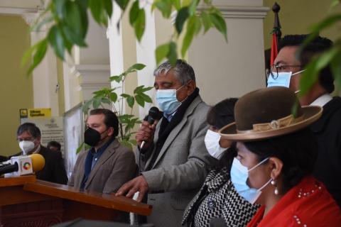 El Alcalde de La Paz ofreció una conferencia conjunta junto a los seis concejales de Por el bien Común-Somos Pueblo: Yelka Maric Palenque, Óscar Sogliano Helguero, Lourdes Chambilla, Jorge Dulon Fernández, Lucía Mamani Salas y Lucio Quispe Intimayta.