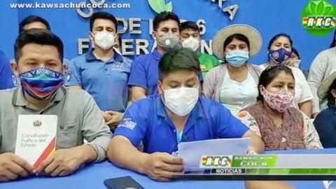 “Damos un plazo de 72 horas a partir de esta fecha para que el TSE se retracte de su posición unilateral, contraria a la normativa vigente. En caso de no cumplir con lo que se manda en la leyes y en respeto al pueblo boliviano iniciaremos movilizaciones indefinidas en todo el territorio nacional”, advirtió el dirigente cocalero Leonardo Loza, en conferencia de prensa.
