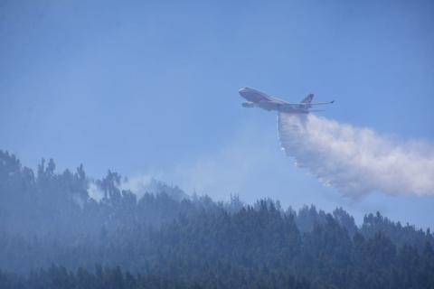 El Supertanker ya realizó una primera descarga de agua sobre el Parque Tunari. Minutos antes, el viceministro de Defensa Civil había descartado que ese avión bombero opere en el lugar.