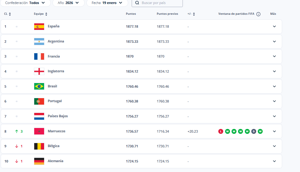 En la actualización del ranking, España se mantiene como líder, seguida por Argentina, Francia, Inglaterra, Brasil y Portugal, entre las selecciones mejor posicionadas del mundo.