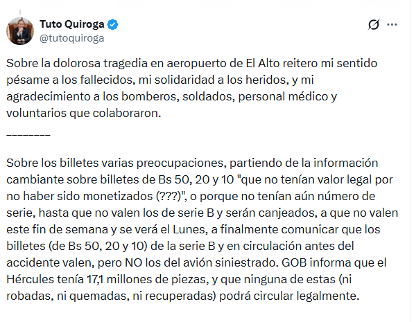 A través de un extenso mensaje en su cuenta en la red social ‘X’, Jorge Tuto Quiroga, el expresidente y otrora candidato a la presidencia – que perdió en segunda vuelta con Rodrigo Paz en los comicios del 2025-, se refirió a la problemática originada por el sustracción – por parte de la población alteña- de parte de los paquetes de billetes de la Serie B que eran trasladados en un avión de la Fuerza Aérea Boliviana (FAB) que se estrelló el viernes en El Alto.