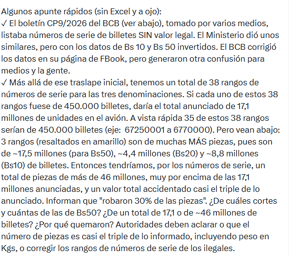 “Partiendo de la información cambiante sobre billetes de Bs 50, 20 y 10 «que no tenían valor legal por no haber sido monetizados (???)», o porque no tenían aún número de serie, hasta que no valen los de serie B y serán canjeados, a que no valen este fin de semana y se verá el lunes, a finalmente comunicar que los billetes (de Bs 50, 20 y 10) de la serie B y en circulación antes del accidente valen, pero NO los del avión siniestrado. Gobierno informa que el Hércules tenía 17,1 millones de piezas, y que ninguna de estas (ni robadas, ni quemadas, ni recuperadas) podrá circular legalmente” (sic), criticó.