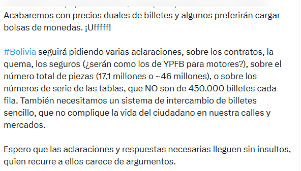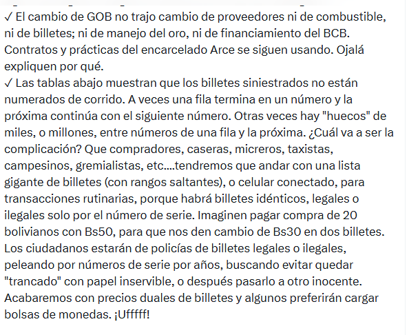 “(…) Tendremos que andar con una lista gigante de billetes (con rangos saltantes), o celular conectado, para transacciones rutinarias, porque habrá billetes idénticos, legales o ilegales solo por el número de serie. Imaginen pagar compra de 20 bolivianos con Bs50, para que nos den cambio de Bs30 en dos billetes. Los ciudadanos estarán de policías de billetes legales o ilegales, peleando por números de serie por años, buscando evitar quedar «trancado» con papel inservible, o después pasarlo a otro inocente. Acabaremos con precios duales de billetes y algunos preferirán cargar bolsas de monedas. ¡Ufffff!” (sic), señaló Quiroga.