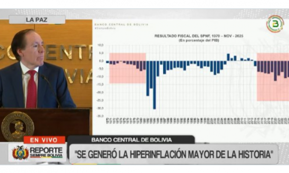 El Presidente del BCB señaló que desde el 2015- 2016 el país presenta continuos déficits fiscales y, por eso, alertó que si seguía ese manejo de la economía Bolivia podía entrar en una nueva hiperinflación. “Estamos ya a la puerta de generar un proceso hiperinflacionario en Bolivia, eso debemos evitar con el concurso de todos”, sentenció.
