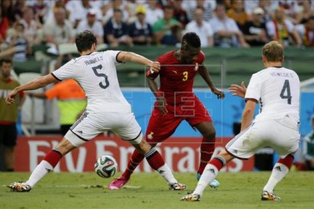 El jugador Asamoah Gyan (centro), de Ghana, con el esférico durante el partido en el que su equipo enfrenta a Alemania por la ronda preliminar del grupo G. (Foto: EFE).