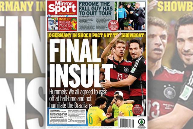 La Paz, 10 de junio (Infobae).- Según reconoció el defensor Mats Hummels en el diario Mirror Sports, los jugadores alemanes acordaron en el entretiempo levantar el pie del acelerador para "no humillar" a su rival. La primera etapa finalizó con un abrumante 5-0 que enmudeció al público que asistió al juego en elestadio Mineirao, de Belo Horizonte.