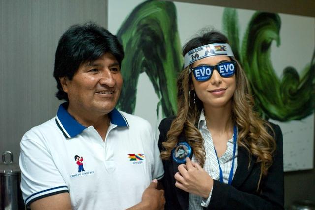 El candidato del MSM mostró en la plaza Murillo una imagen del Presidente, donde se lo ve acompañado de la cónsul de Bolivia en Nueva York, Jessica Jordan, quien luce un cintillo en la cabeza que dice “Generación Evo”, unos anteojos con la inscripción “Evo” y un botón con el rostro del presidente candidato. El presidente lleva puesto una polera con las iniciales “Con Evo vamos bien”.