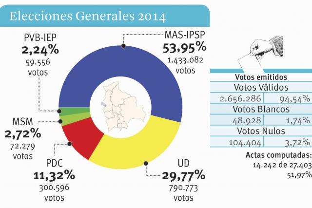 Al 51 por ciento de los votos computados, el Movimiento Al Socialismo, cuyo candidato ha sido el presidente Evo Morales, tiene el 53,95% de los votos, mientras que la Unidad Demócrata, con Samuel Doria Medina, ha logrado el 29,77%.