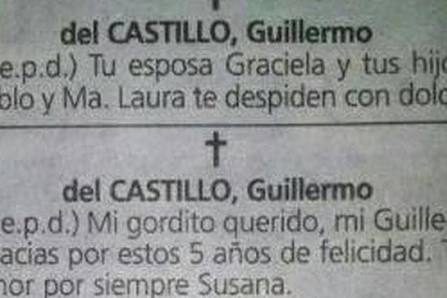 “Tu esposa Graciela y tus hijos Pablo y María Laura te despiden con dolor”, decía la primera de las notas. Y “Mi gordito querido, mi Guille… Gracias por estos 5 años de felicidad. Tu amor por siempre, Susana” era el mensaje de la segunda. Publicados uno a continuación del otro, para sorpresa de ambas mujeres, y también para gran parte de los conocidos y amigos del fallecido, que al leer la página del diario no dudaron en fotografiar ambas esquelas y compartirlas a través de WatsApp, con lo que el mensaje se convirtió en viral en pocas horas.