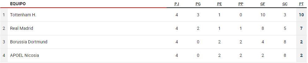 Si el Real Madrid gana en Nicosia estará en octavos. El Dortmund necesita un imposible: ganar los dos partidos que le quedan y que el equipo de Zidane naufrague en las dos jornadas. Otra cosa es el liderato del grupo. El Tottenham tiene la clasificación asegurada y será primero si repite el resultado que haga el Real Madrid ante el APOEL. Si no, deberá vencer a los chipriotas en la última jornada para asegurar la primera plaza.