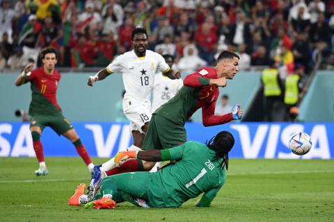 Cristiano Ronaldo anotó el primer tanto de su equipo, por un dudoso penal, y así se convirtió en el primer futbolista en anotar en cinco mundiales distintos.
