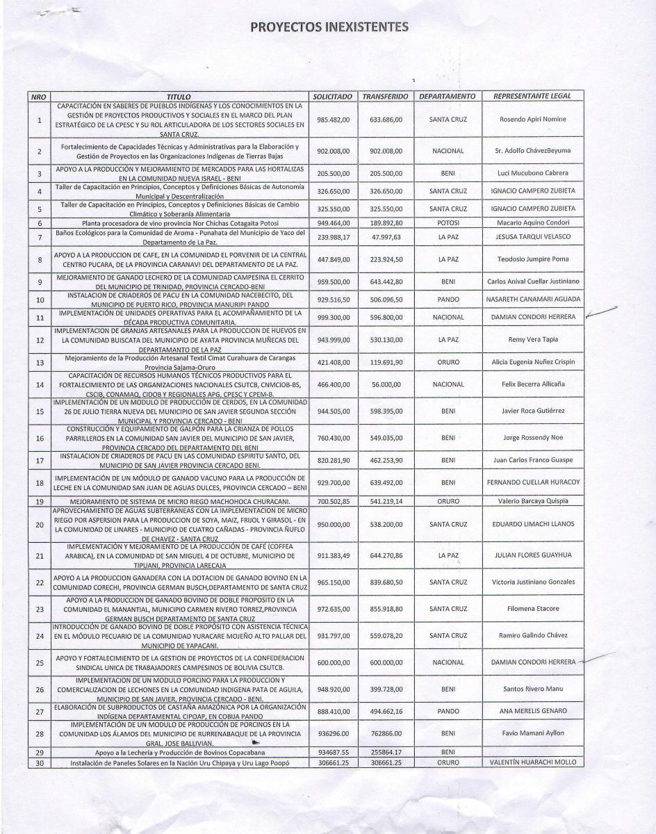 Durante las cuatro gestiones, se registraron 3.177 proyectos de los cuales, 2.077 no tenían ningún desembolso y los 1.100 proyectos recibieron Bs 729.132.136, de los cuales 216 se encuentran con plazo vigente y 844 no están vigentes.