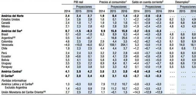El FMI da a conocer que el riesgo de recesión ha aumentado en los grupos América Latina. “Ese aumento, que pone de relieve la agudización ya señalada de los riesgos para las economías de mercados emergentes, refleja niveles de partida más bajos para el crecimiento, dados el debilitamiento del crecimiento de estas economías como grupo observado en el segundo trimestre de 2015 y la desmejora de los pronósticos a corto plazo”, se lee en parte del informe.