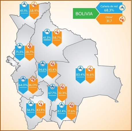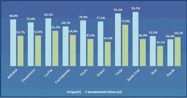El departamento con mayor acceso al agua es Santa Cruz con 93,7%. En cambio, en Tarija se registra la mayor cobertura de saneamiento: 72 de cada 100 tarijeños cuentan con este servicio.