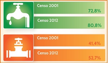 Entre los censos 2001 y 2012, el acceso al agua subió en 8 puntos porcentuales, es decir de 72,8% a 80,8%, mientras que la cobertura de saneamiento básico incrementó en 11 puntos porcentuales, es decir de 41,4 % a 52,7%.