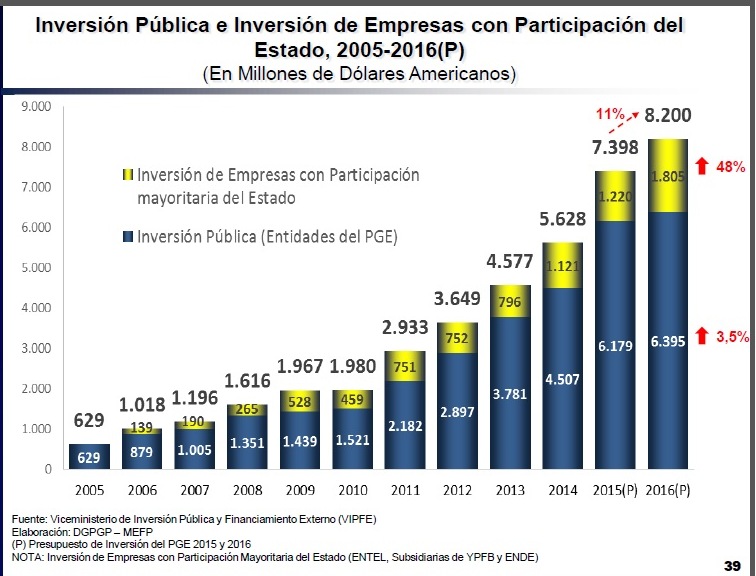 Según el proyecto presentado por el Ministerio de Economía, Bolivia tiene pensado realizar una inversión pública de 6.395 millones de dólares durante la gestión 2016, sólo tomando en cuenta las entidades sujetas al Presupuesto General del Estado (PGE).