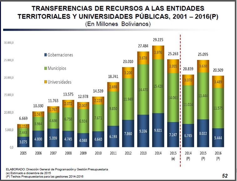 En total, durante el 2015, las gobernaciones, municipios y universidades recibieron 25.095 millones de bolivianos. En cambio, el 2016 recibirán 20.509 millones de bolivianos.