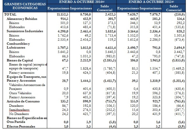 En la categoría de Artículos de Consumo también se presentó déficit (765,8 millones de dólares); Sin embargo, es importante indicar el aumento de las exportaciones de joyería de oro con valor agregado –de 31,3 millones de dólares a octubre de 2014 a 66,4 millones de dólares a similar período de 2015.