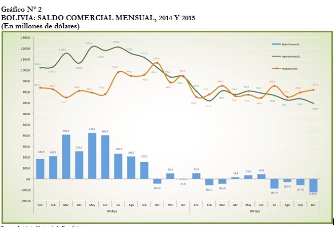 Respecto al origen y destino de los bienes comercializados por Bolivia con el resto del mundo, entre enero y octubre de 2015, el saldo comercial fue positivo con Brasil por un valor de 804,0 millones de dólares; similar comportamiento se registró con Argentina, Colombia y Estados Unidos con 438,4 millones de dólares, 341,0 millones de dólares y 88,7 millones de dólares, respectivamente.