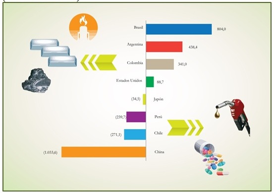 Hasta octubre de 2015, el intercambio comercial con la República Popular de China presentó valores negativos (1.033,6 millones de dólares). Déficits también se registraron en las balanzas comerciales con Chile (271,1 millones de dólares), Perú (239,7 millones de dólares) y Japón (34,5 millones de dólares).