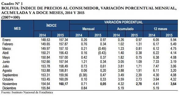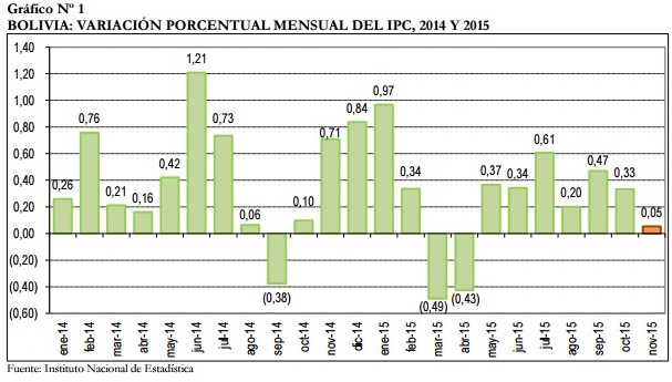 La Paz, 3 de diciembre (Oxígeno).- Entre enero y noviembre de este año, la inflación acumulada llegó a 2,78%. Según los datos proporcionados por el Instituto Nacional de Estadística, la variación acumulada a doce meses llegó a 3,64% y la variación porcentual del Índice de Precios al Consumidor (IPC) en noviembre fue de 0,05%.