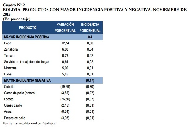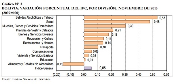 La variación positiva de noviembre se debió principalmente al incremento de los precios en las divisiones de Muebles, Bienes y Servicios Domésticos con 0,30% e incidencia positiva de 0,02% y Restaurantes y Hoteles con 0,14% e incidencia positiva de 0,02%, Por otro lado, la división Alimentos y Bebidas no Alcohólicas presentó decremento de precios de 0,15% e incidencia negativa en 0,05%.