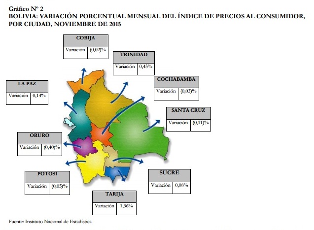 La variación positiva de 0,05% se explica por la variación porcentual positiva en las siguientes ciudades: Tarija 1,36%, Trinidad 0,43%, La Paz 0,14% y Sucre 0,08%. Por otro lado, las urbes que presentaron variación porcentual negativa fueron Oruro 0,40%, Santa Cruz 0,11%, Potosí 0,05%, Cochabamba 0,03% y Cobija 0,02%.