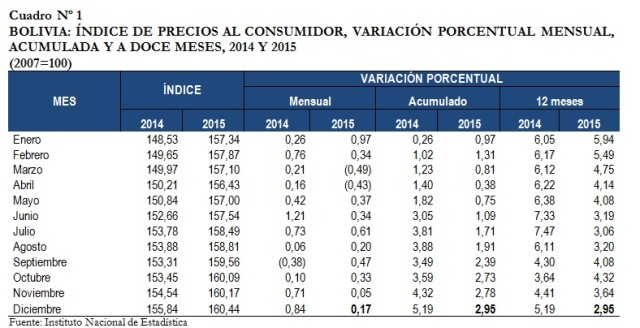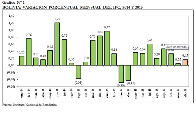 El Índice de Precios al Consumidor (IPC) registró en diciembre de la gestión anterior que la variación porcentual positiva de 0,17% respecto al índice de noviembre, menor a la registrada en 2014 con variación de 0,84%