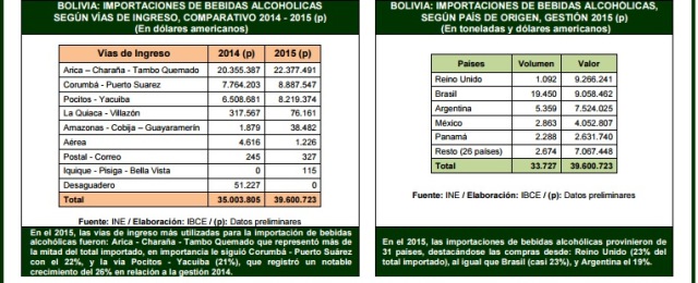 En el 2015, las vías de ingreso más utilizadas para la importación de bebidas alcohólicas fueron: Arica - Charaña - Tambo Quemado que representó más de la mitad del total importado, en importancia le siguió Corumbá - Puerto Suárez con el 22%, y la vía Pocitos - Yacuiba (21%), que registró un notable crecimiento del 26% en relación a la gestión 2014.
