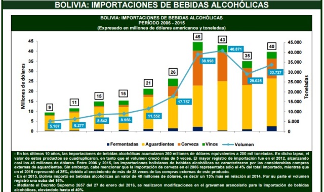 En el 2015, Bolivia importó en bebidas alcohólicas un valor de 40 millones de dólares, es decir un 15% más en relación al 2014. Por su parte el volumen registró una suba del 16%.