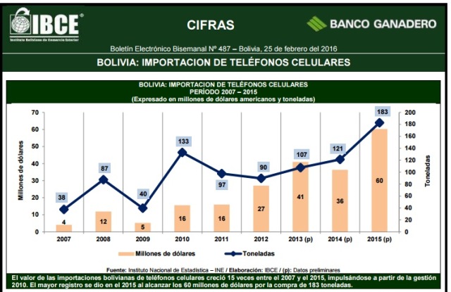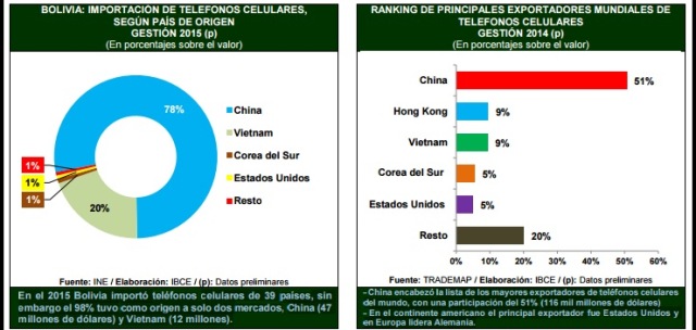 El boletín del Instituto Boliviano de Comercio Exterior (IBCE, señala que en el 2015 Bolivia importó teléfonos celulares de 39 países, sin embargo el 98% tuvo como origen a solo dos mercados, China (47 millones de dólares) y Vietnam (12 millones).