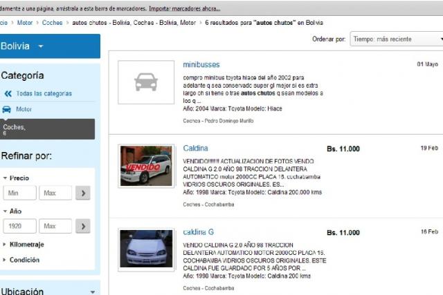 La Paz, 24 de julio (Oxígeno).- Los comerciantes de autos apuestan a la red Internet para la comercialización de vehículos indocumentados en Bolivia. El periódico digital Oxígeno.bo pudo visitar páginas web que sirven como espacios para ese cometido.