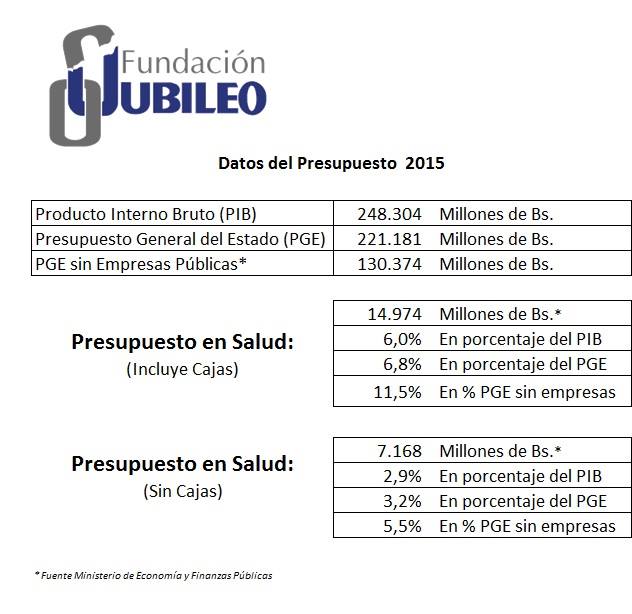 La Paz, 12 de junio (Oxígeno).- La fundación Jubileo informó hoy que el presupuesto destinado por el Gobierno para el área de salud es de un 6,8% del Presupuesto General del Estado (PGE) 2015 y no así a un 11,5% como indicó el ministro de la Presidencia, Juan Ramón Quintana.