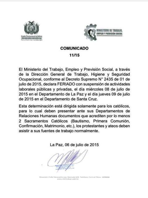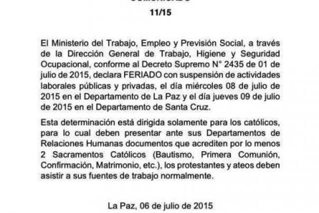 El comunicado falso indica que los feriados son sólo para los católicos. La Viceministra de Trabajo, Giovanna Maldonado, aclaró en conferencia de prensa, que ese documento es falso y que el Ministerio de Trabajo no emitió ningún comunicado referido a los feriados del 8 y 9 de julio. Y anunció la presentación de una denuncia penal ante el Ministerio Público para que se investigue la procedencia de ese documento fraguado.