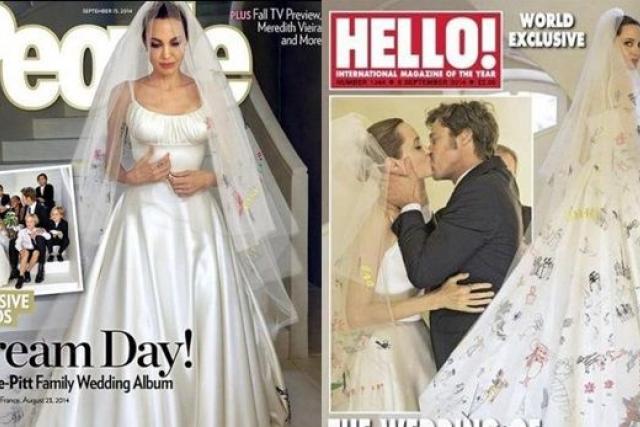El vestido de la actriz fue decorado por pinturas de sus hijos, quienes tuvieron un papel importante en la boda, pues los mayores: Maddox (de 13 ños) y Pax /(10) llevaron a su madre hasta el altar.