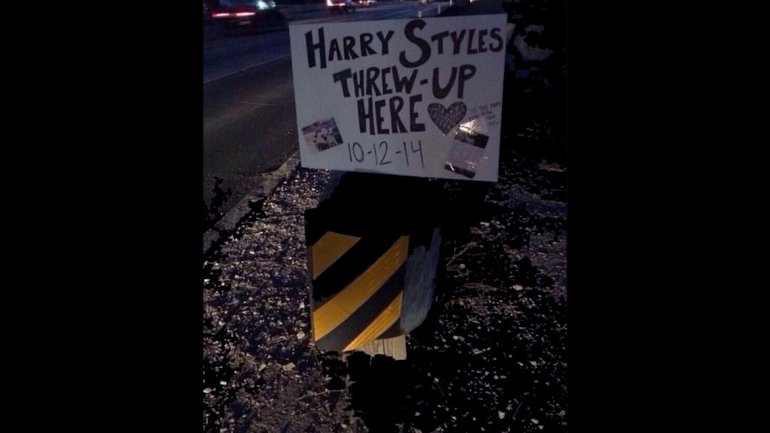Los fanáticos del cantante, de 20 años, vieron las imágenes de ese momento y decidieron crear un tipo de santuario en el lugar al colocar un cartel al lado de la carretera que dice: "Harry Styles vomitó aquí el 12-10-14″.