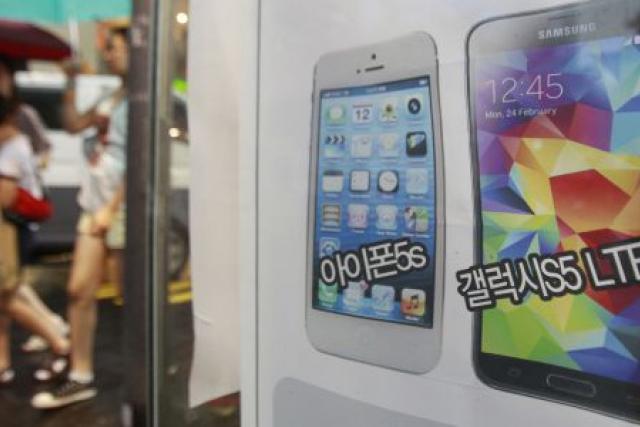 Un anuncio de un móvil de Samsung junto a uno de Apple en una tienda de Seúl. / AP (Foto: El País)