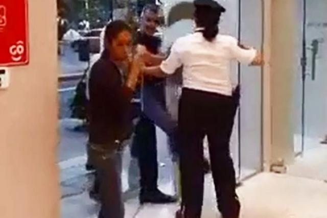 Aun así, los guardias retuvieron por varios minutos al hombre en la puerta del local. El hombre intentó evitar que lo saquen a la fuerza apoyando la pierna en la puerta y el custodio perdió la paciencia estirándolo con fuerza hasta que la puerta de vidrio se rompió y el cliente cayó al piso.