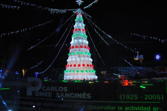 El árbol navideño más grande de Bolivia tiene 35 metros de altura y un pesebre en tamaño real, todo emplazado en 200 metros cuadrados en plaza Tejada Sorzano. El alcalde de La Paz, Iván Arias, que llegó caminando la noche de este jueves, desde el Parque Urbano Central, donde previamente inauguró la feria navideña, encendió el árbol, en el primer día del mes del amor, de la familia y de la reconciliación.