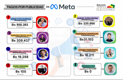 La inversión más pequeña fue de Bs 100 y las más altas se acercan al millón de bolivianos. Así, en los casos de Pavel Aracena (ADN) y Rodrigo Paz (PDC) se reporta un gasto de Bs 100 y 200, respectivamente; en tanto que para promocionar a Jorge Quiroga (Libre) y Samuel Doria Medina (Alianza Unidad) se destinaron Bs 976.137 y Bs 806.058, en el orden citado.