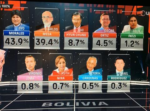 Según los resultados preliminares publicados por el Tribunal Supremo Electoral al 89%, Carlos Mesa está en segundo lugar con el 38,6% de los votos, frente al 45,28% de Evo Morales.