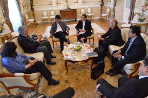El canciller David Choquehuanca; el ministro de la Presidencia, Juan Tamón Quintana, el embajador en Holanda y agente de Bolivia ante la Corte Internacional de Justicia (CIJ), Eduardo Rodríguez Veltzé; el procurador del Estado, Héctor Arce; la cónsul de Bolivia en Chile, Magdalena Cajías; el embajador en Perú, Gustavo Rodríguez, y el director de la Dirección Estratégica de Reivindicación Marítima (Diremar), Emerson Calderón, se reunieron con el presidente Evo Morales.