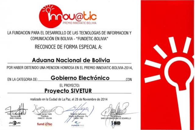 El desarrollo e implementación del proyecto SIVETUR (Sistema de Ingreso y Salida de Vehículos Turísticos), permitió a la Aduana Nacional recibir una mención honorífica en el premio InnovaTIC Bolivia que lleva adelante la Fundación FUNDETIC (Fundación para el Desarrollo de Tecnologías de Información y Comunicación en Bolivia).